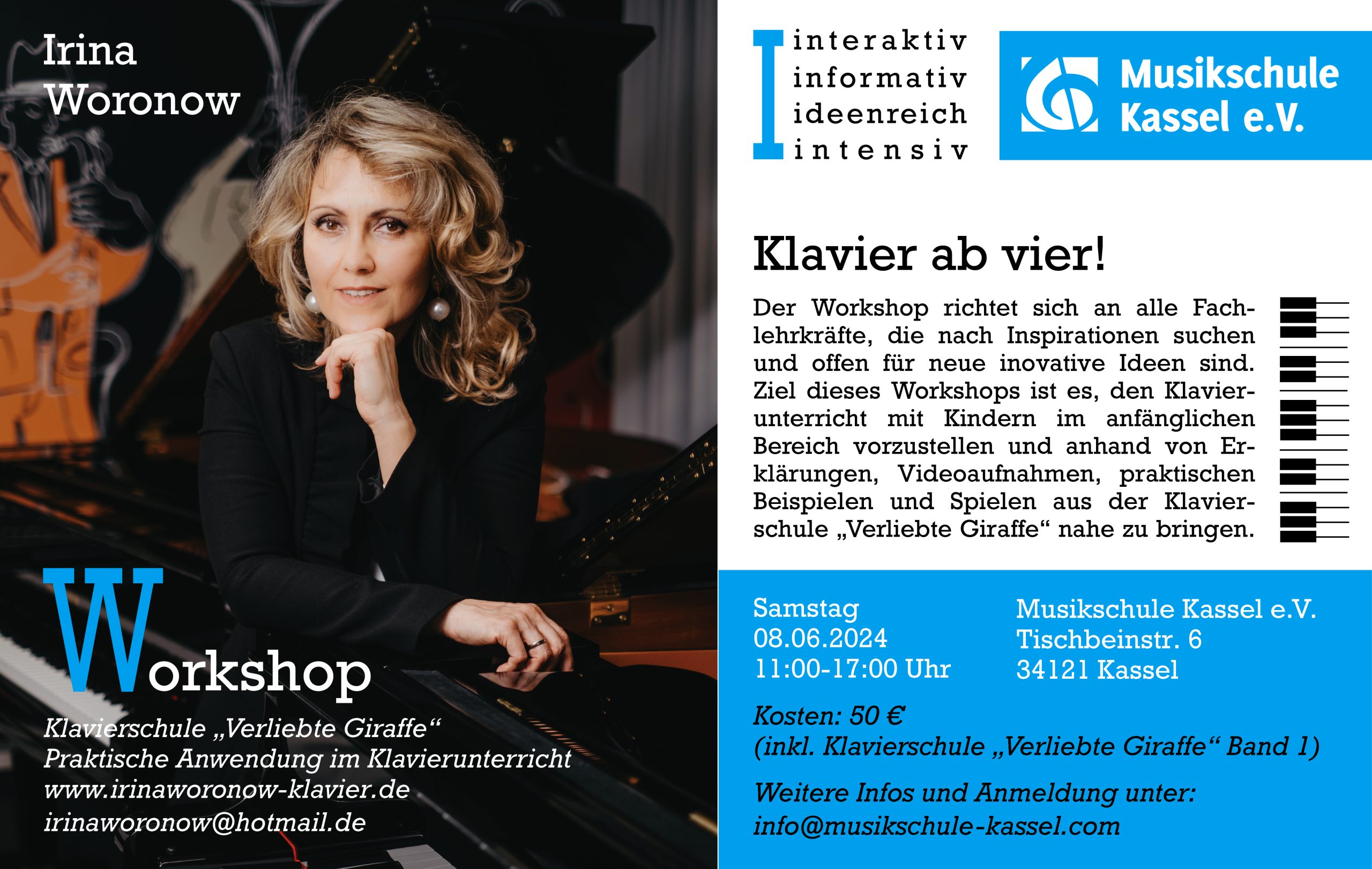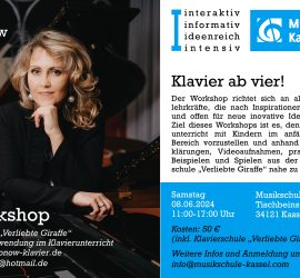 Am Samstag, den 08. Juni stellt Frau Irina Woronow von 11:00 – 17:00 Uhr ihre Klavierschule „Verliebte Giraffe“ und ihre Konzeption vor.Der Workshop richtet sich an Klavierlehrkräfte, die nach Inspiration suchen und offen für neue innovative Ideen sind. Der Workshop kostet 50,-€ pro Person (inkl. Klavierschule) und ist auf eine […]