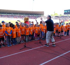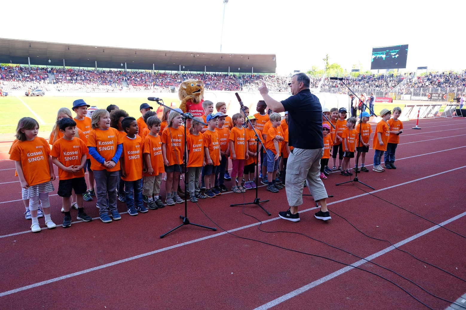 Am Ostermontag sangen einige Kinder aus dem Chorprojekt Kassel SINGT! vor 15.488 Zuschauern beim Hessenliga-Spiel im vollen Auestadion in Kassel. Gastgeber KSV Hessen Kassel gewann bei diesem Spiel 3:1 gegen den KSV Baunatal.